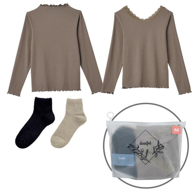こちらもプチプラのあやさんプロデュースアイテムで、2WAYトップス、メローネックトップス、ふわふわの靴下2足の4点セットです。抗菌防臭加工の可愛いポーチに入っています。