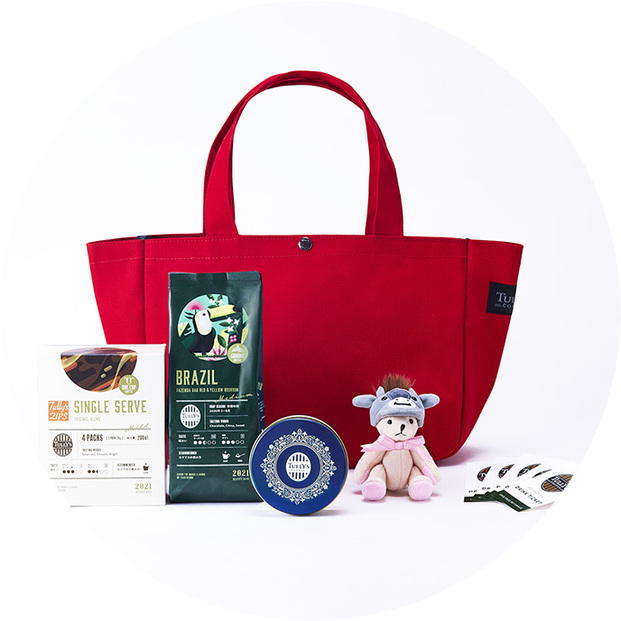 干支ミニテディが付く3500円の福袋には、オリジナルトートバッグに限定ビーンズやミルクティーキャンディ・ドリンクチケット5枚などが入っています。トートバッグはレッドとブルーの2種類です。サイズ感も丁度良く、シンプルデザインなので使いやすそう。プレゼントにも喜ばれそうな素敵な福袋ですね。