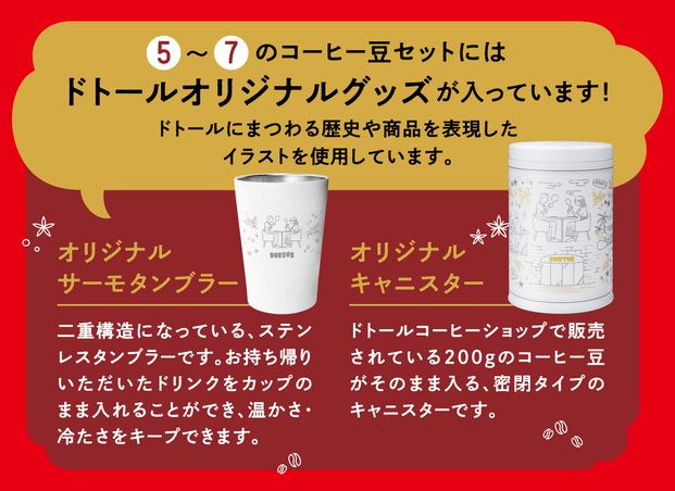 豆5袋にコーヒーミルやドリンクチケット20枚などが入っている10000円バッグ。ミル付きなので豆挽きからカフェタイムを堪能できるスペシャルな福袋です!
