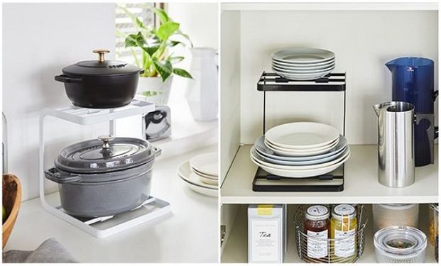 1つ目のアイテムは、重たい土鍋や鋳物鍋などを収納できる2段のスタンドです。小さめの鍋を上に、大きめの鍋を下にとまとめて置くことができて省スペースに。キッチンカウンターや作業台の一角に設置すれば、重たい鍋もサッと取り出してすぐに使えます。