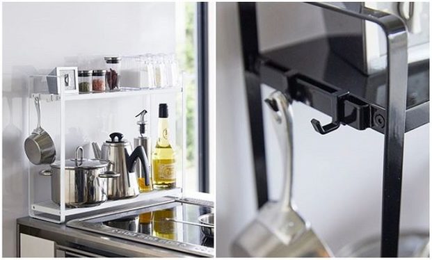 食器棚の中にも設置が可能で、もちろん鍋以外のものを重ねて置いてもOK。収納部分には、滑り止めとなって傷も防ぐクッション付きで安心です。取り外し可能なフックが付属していて、ミトンや鍋つかみ、お玉などを引っ掛けておくこともできます。