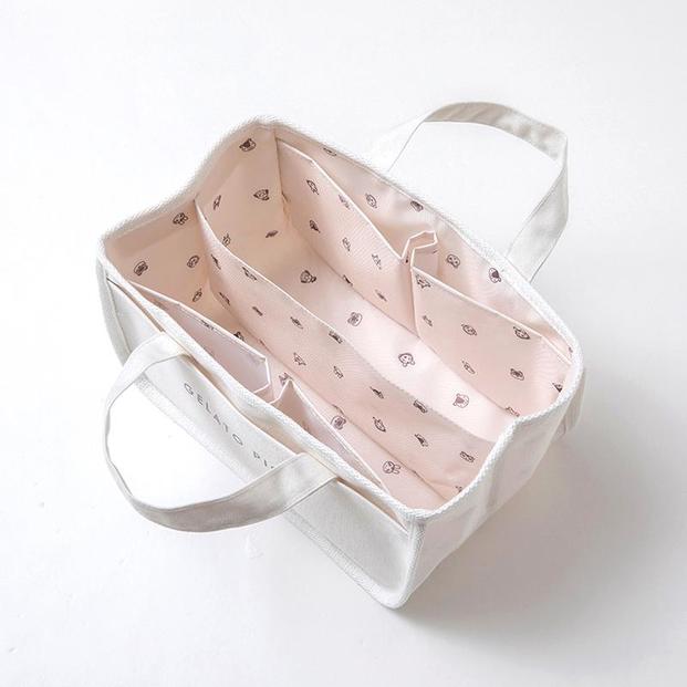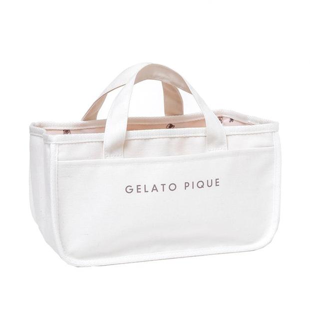 トートバッグはシンプルなデザイン。5つのポケットが付いていて、収納力が抜群です。ジェラートピケのロゴやつぶまめのタグが付いており、部屋に置くだけでインテリアとして活躍してくれます。ちょっとしたお出かけにも便利です。サイズはH15×W27.5×D17cm。