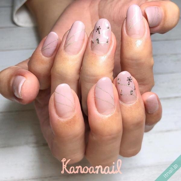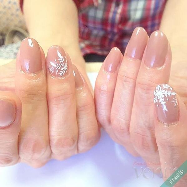 最初にご紹介するのは、ベージュやピンクベージュ、クリアピンクといった上品色を使ったワンカラーネイルに、雪の結晶をアートしたデザインです。