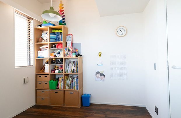 ご主人が最もこだわったというのがLDKの壁一面のレンガ。レンガ調の壁紙かと思いきや、本物のレンガを積み上げて仕上げたのだそう。「部屋が狭くならないように奥行き5㎝ほどのレンガを半分に割って薄くし、それを職人さんがひとつひとつ積み上げてくれました。圧迫感が出ずに、それでいて落ち着ける色味を探してパーツ屋さんを巡ってしっくりくるこの淡めの赤レンガに決めました。レンガって耐熱性、耐水性に優れているので、熱に強く、カビも生えにくいということで、キッチンの作業台前まで思い切ってレンガにして横に視線が広がるようにしました。施工後5年が経ちましたがレンガ壁で困ったトラブルもありません」