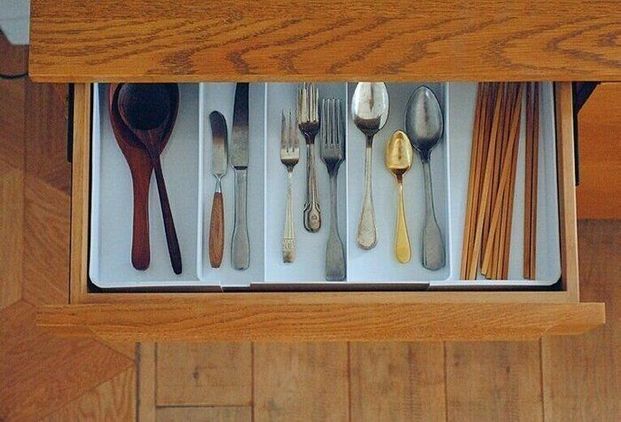 使うスペースの広さや整理したい物に合わせて、縦横両方に広げることができるトレー。長い菜箸までスッキリ整理できる。