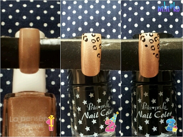 ネイルアート用の筆(細筆)か、フラットブラシ(平筆)、もしくは4で垂らしたトップコートの筆そのままを使って、ランダムに置いたチョコレート色を崩していく。