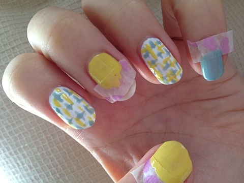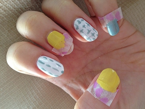 しっかりとベース色のマニキュアが乾いたのを確認したら、次に、1色目のマニキュアを爪楊枝につけます。そして、十字線を雑に書いていきましょう(´∀`*)2色目・3色目のマニキュアも1色目のマニキュアと同様に。