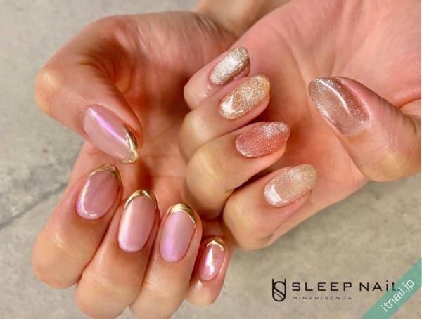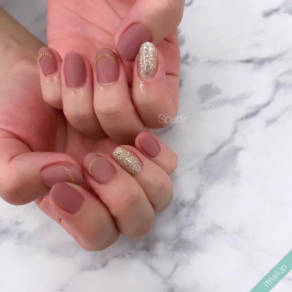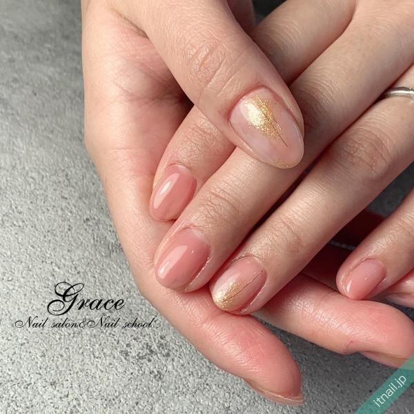 透け感たっぷりのヌーディピンクは、指先に上品なツヤを演出します。ピンクがほんのりと色づいて血色よくみせてくれるから、ヘルシーで女性らしい印象も抜群。繊細なゴールドのラメをまとって美しく彩りましょう。