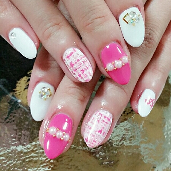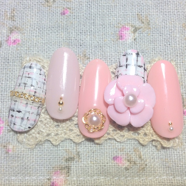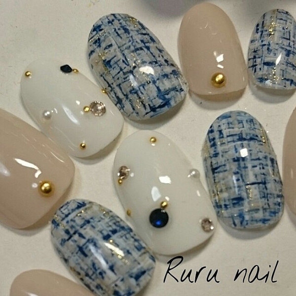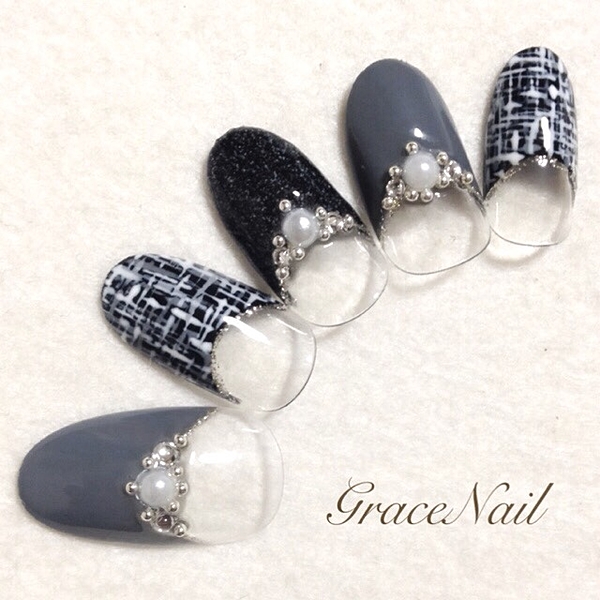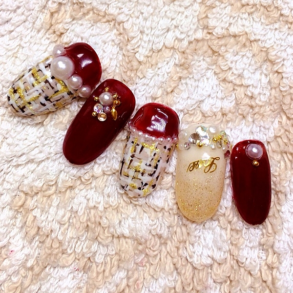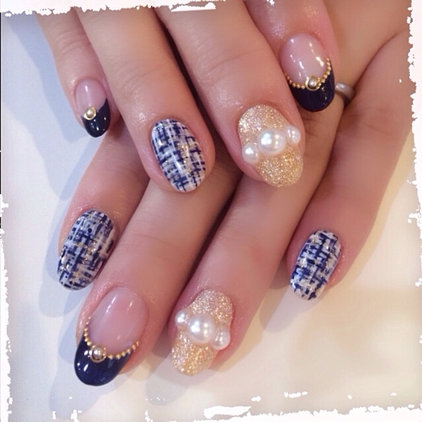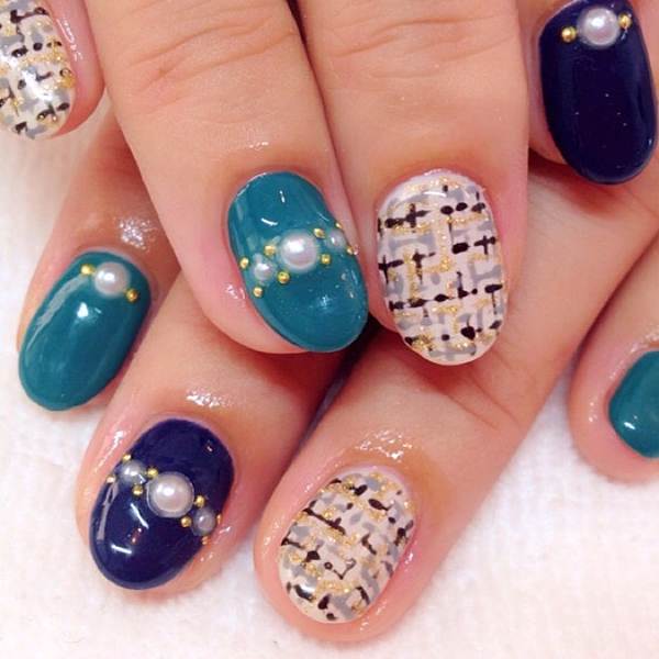 メタリックカラーや大きめパールで人と被らないツイードネイルに。