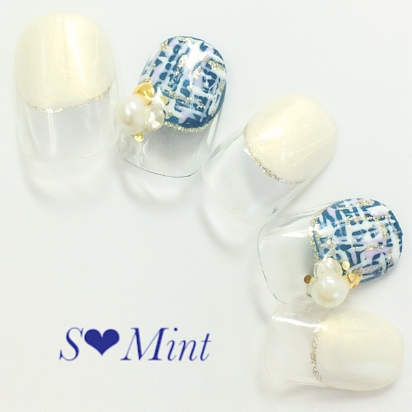 ツイードの大きなリボンが印象的なネイルデザイン。