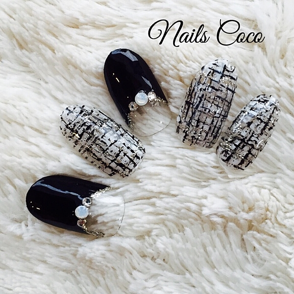 ブラック×ベージュが大人っぽいツイードネイルに。