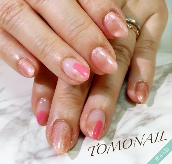 パールカラーを使った塗りかけネイルもおすすめです。繊細な質感が上品に映えるので、ラフな塗りかけデザインもハイセンスな仕上がりに。ビビッドなピンクカラーとかけ合わせて、美しい色の重なりを満喫しましょう。