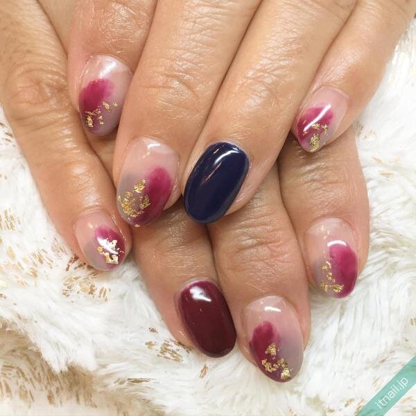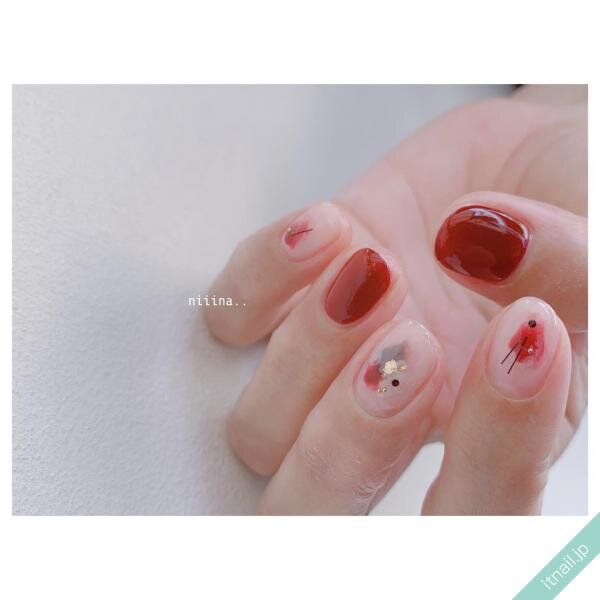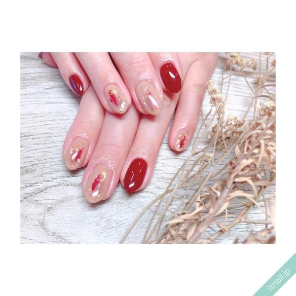 ボルドーとベージュの組み合わせで女性らしくまとまったデザイン。ともすればちぐはぐ感が出てしまいそうなコーディネートは、ベージュの上にボルドーの塗りかけアートをまとうことで統一感を。デコレーションも上品です。