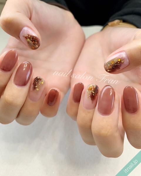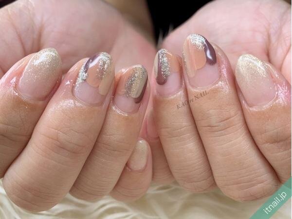 ベージュやブラウンなど、あたたかみのあるカフェカラーを使った塗りかけネイル。爪の真ん中にデザインを施すのは少しバランスが要りますが、爪先に向けて塗るスタイルなら初心者さんも挑戦しやすいですよ。ラメのトッピングも高見えしておすすめ。