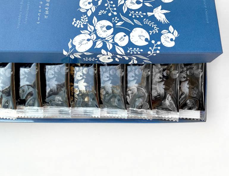 ブルー4枚に加えて、ライトブルー4枚、ホワイト1枚の全3種9枚が、バタフライピーの花のモチーフと小鳥をあしらった高級感のある箱に詰め合わせられている。箱の中にはメッセージカードも入っているので、「幸せ」を届けたい大事な人への、日頃の感謝の想いを伝えるプレゼントとしてもぴったりだ。