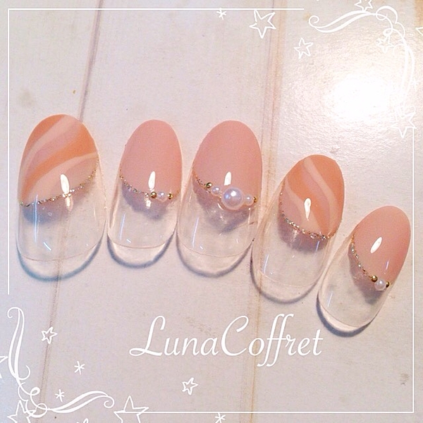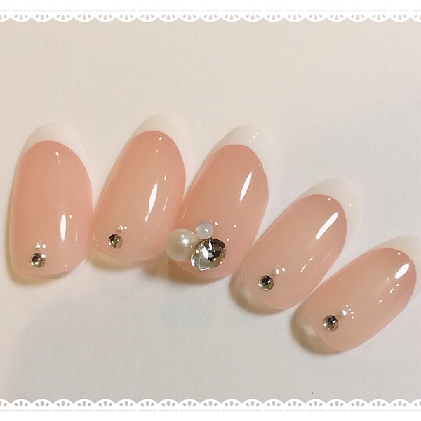 ピンクベージュとホワイトの変形フレンチデザイン。
