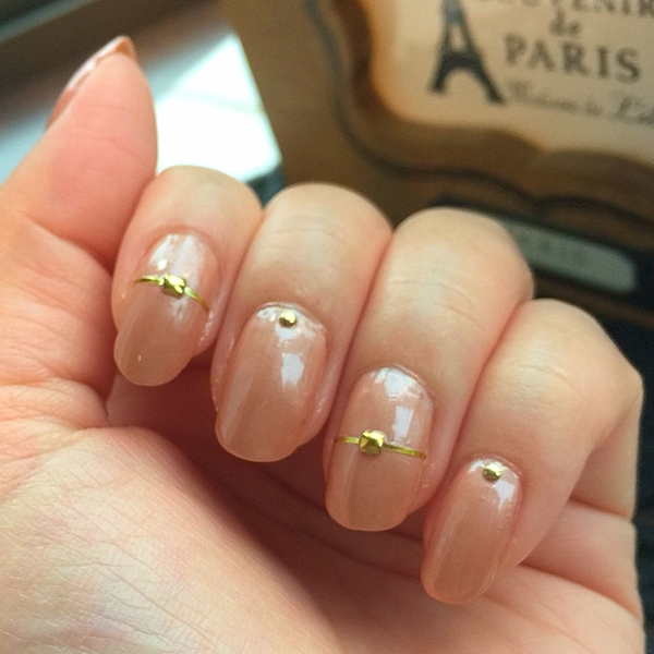 メタリックなベージュネイルにゴールドのラインをプラスして。