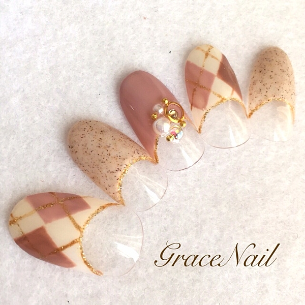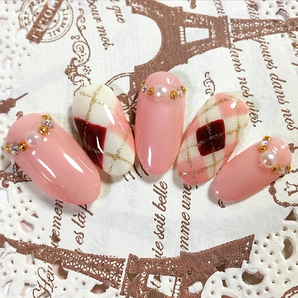 アイボリーの逆フレンチにピンクベージュで大きめのアーガイル柄を描いて・・♪