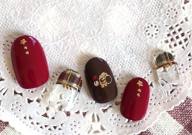 赤や茶色のネイルに、チェック柄でアクセントをほんのりと加えれば、ほっこり可愛いクリスマスネイルの完成です♡