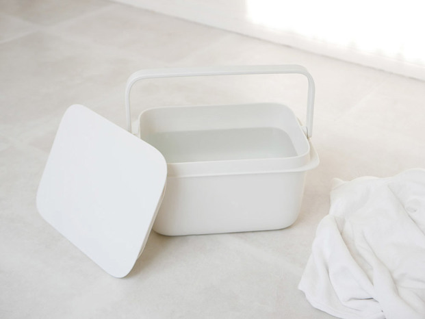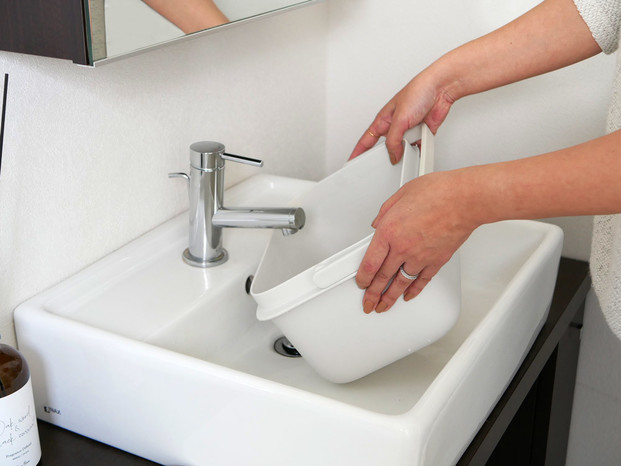浅型だから洗面台でも水が入れやすく、角にフィットしてすっきり収納できるスクエア型「バケツ」。