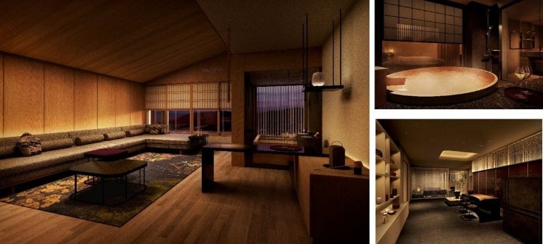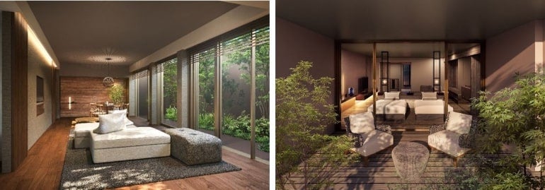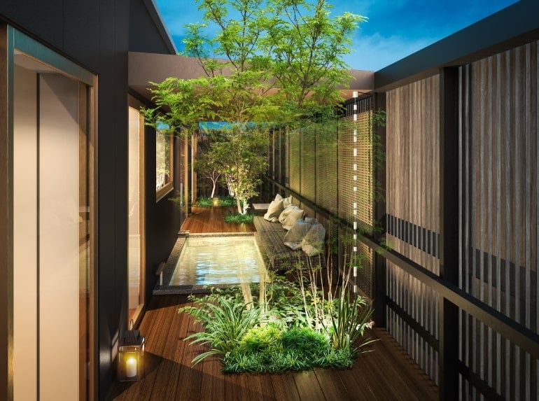 上層階でも地に根づく緑や木漏れ日、地、風を感じることができるよう、全室にプライベートガーデンテラスを完備。テラスでは、自家源泉の露天風呂で鳥の声に耳を傾けたりシャンパンと読書で自分らしい時間を過ごしたり、夜は木の間の月明かりに癒やされたりと、新しい日本のラグジュアリー空間を満喫できる。