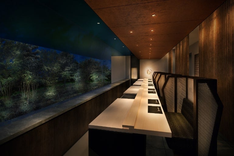 食事は、鮨の匠が近海の獲れたての海鮮で腕をふるう。4つのカウンターがあり、いずれもハイバックチェアを採用。プライベート性がしっかりと保たれている。もちろん酒器や料理を盛る器も厳選。鮨を通じて四季を感じられる趣向だ。