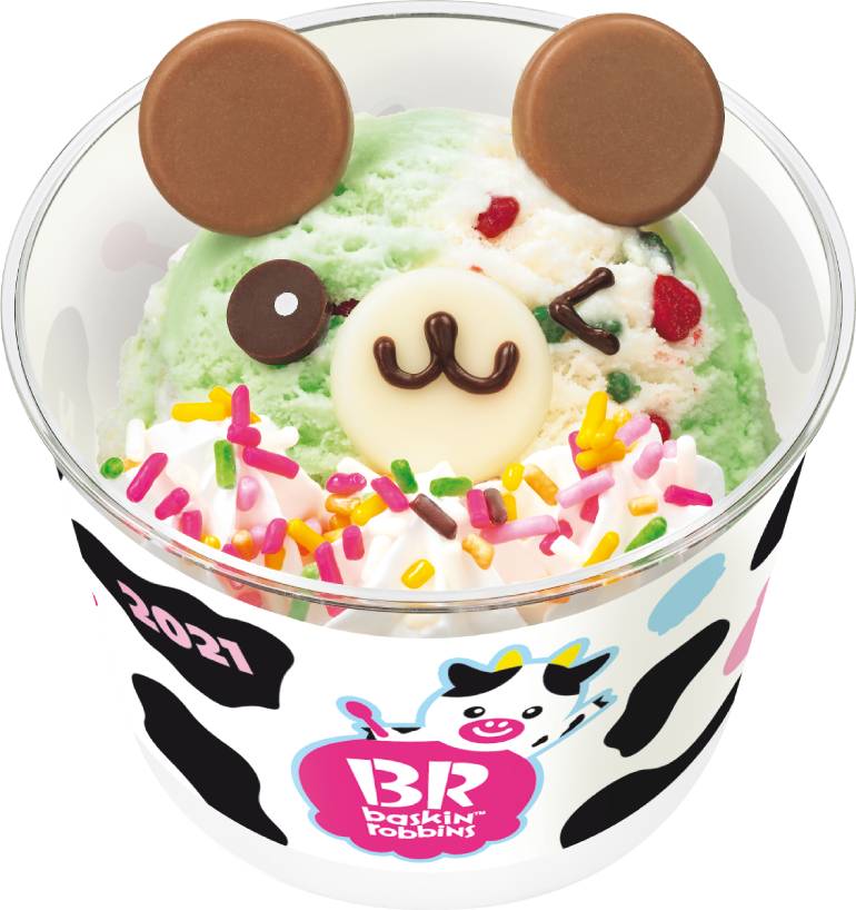 「うし」には、通年販売されている「うさぎ」「ぱんだ」「くま」といった仲間の「ハッピードール」もいる。チョコでできたピンクのリボンと大きい耳が可愛い「うさぎ」はホイップクリームとカラーチョコスプレーが添えられ、カラフル。