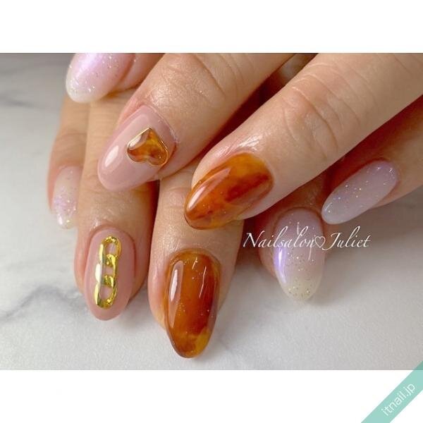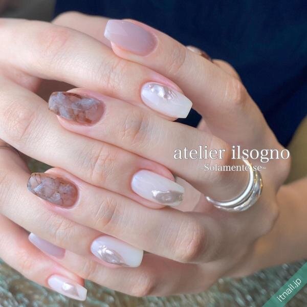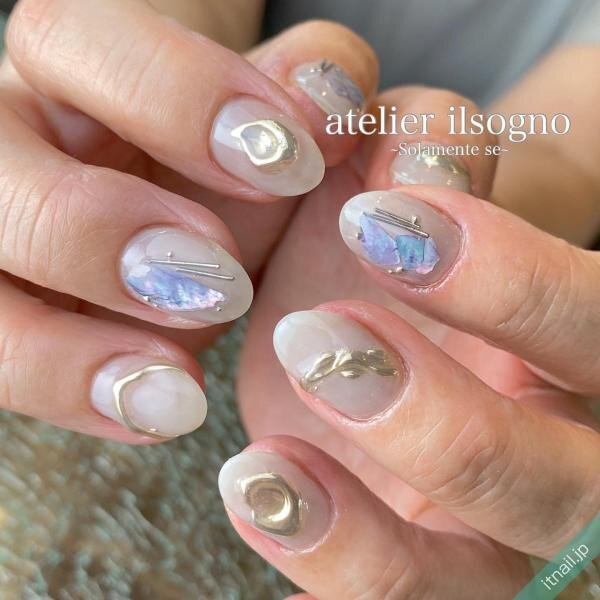 人気のアシンメトリースタイルって、一歩間違えると違和感が出てしまう心配がありますよね。でも、一方の手を落ち着いた透け感ホワイトでまとめると、比較的どんなデザインともマッチしやすいです。大人のちぐはぐネイルに最適ですよ。