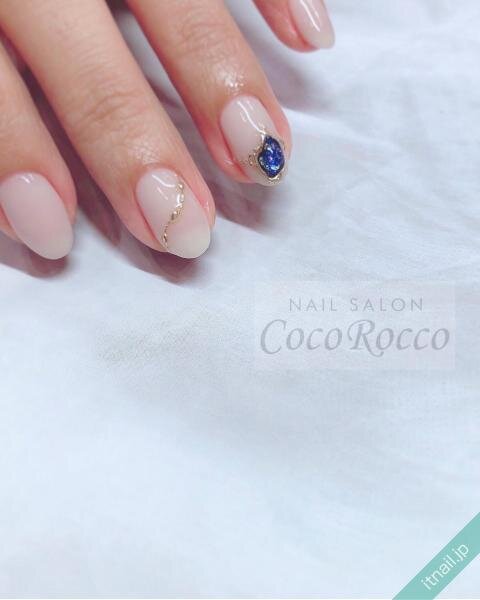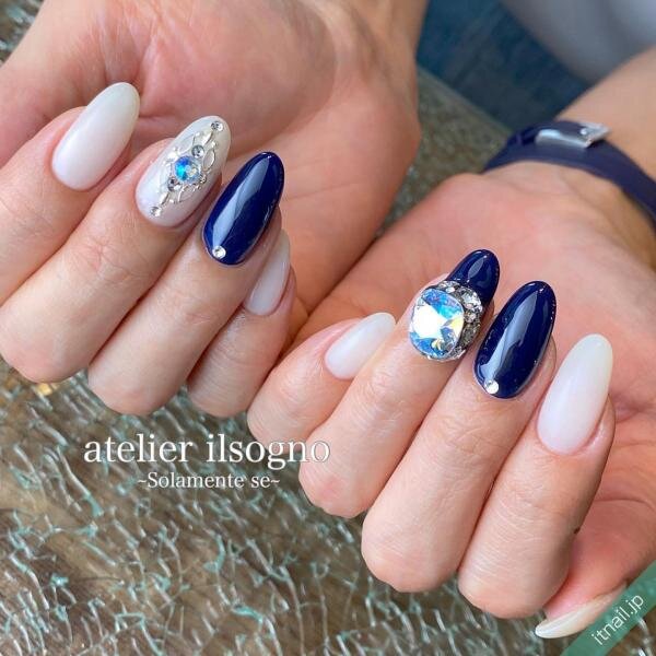 ピュアなホワイトネイルに、印象的なブルーのアクセントをかけ合わせたデザイン。煌びやかに輝いて、上質なアクセサリーをまとったような雰囲気が漂っています。シンプルだけど、ハッとするほどにオシャレ。