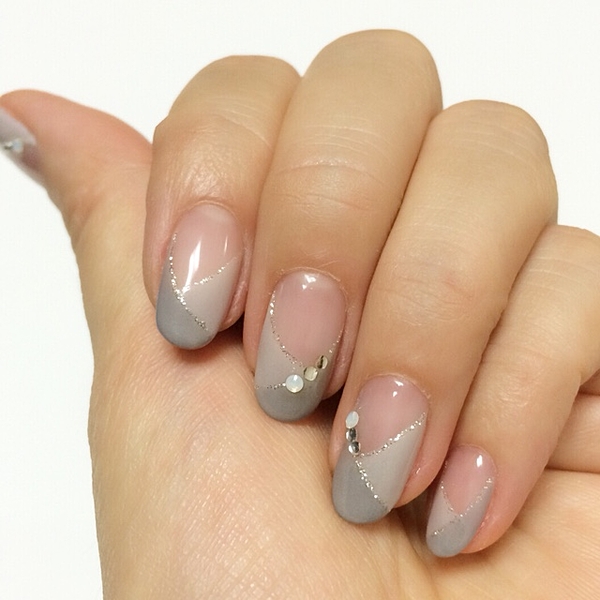 ミルキーピンクで逆フレンチにして、シルバーのラメラインを細く入れて・・