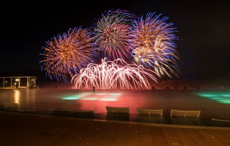 外気浴スペースからは、日中は広大な阿寒湖を一望でき、夜はアイスキャンドルが並べられた幻想的な空間で、満点の星空を見ることができる。さらに、2021年2月1日(月)からは打ち上げ花火も開催され、ここでしか見ることができない絶景を眺めながら、極寒の外気浴を楽しめるのだ。
