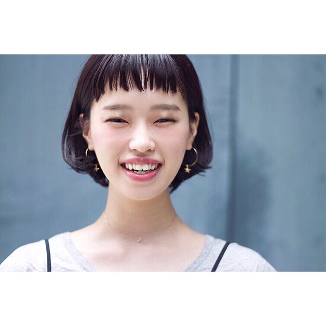 前髪を眉毛よりもかなり高めにカットしたマッシュボブです。オン眉な前髪で若見え効果抜群です。