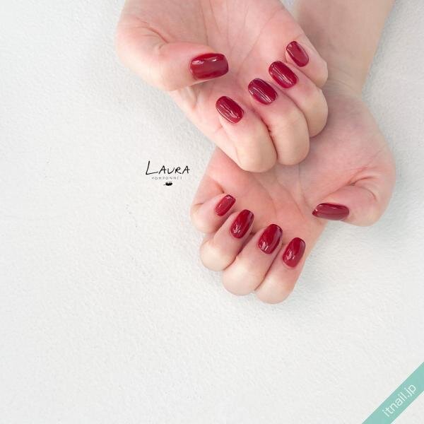 シンプルな一色塗りでまとめた赤ネイルは、その潔さがオシャレな印象を際立ててくれます。女度が高くなりすぎる心配は、爪を短く揃えることで解決。先端を四角く整えたスクエアオフスタイルもGOODです。