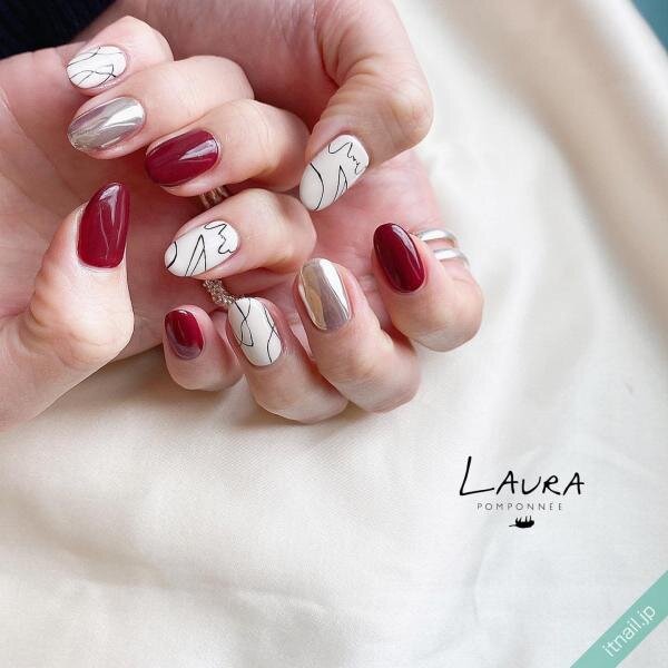 芸術作品のようなモダンアートとミラーネイルをかけ合わせた今っぽさが溢れるネイルデザイン。そこに鮮やかなレッドを差し込むことで、凛とした色っぽさがグッとアップします。片手に2本くらいのバランスが上品。