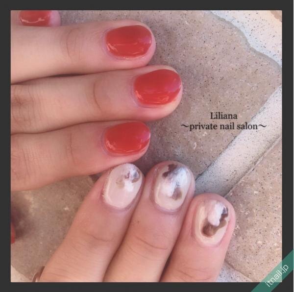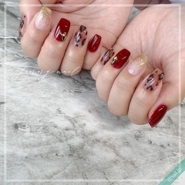 見た目の華やかさを格上げしてくれる赤は、指先にオシャレなアクセントを添えてくれます。透け感がキレイなレオパード&さりげないラメネイルのデザインは、赤を取り入れることでファッショナブルにきまります。
