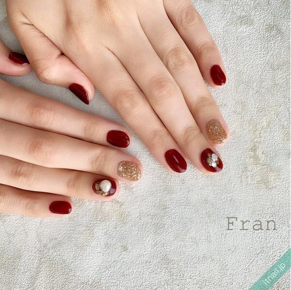 深みのある色合いが魅力の赤ネイルには、上品なデコレーションが好相性。シェルやパールといった、清潔感のあるアイテムを選ぶのがおすすめです。エレガントなゴールドラメも間違いない組み合わせ。