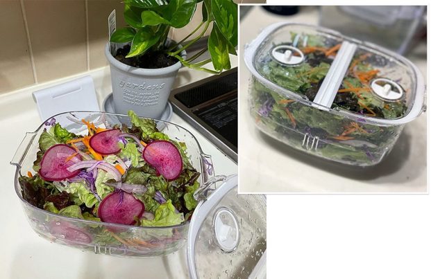 6人家族の@mamagohan6さん。朝食に出すサラダの準備を楽にできないかと考えていたときに出合ったのが「フレッシュキーパー」。「6人と大家族なので、朝食のサラダを用意するだけでも野菜を洗って水をきってと結構大変で。この商品は、穴が空いたバスケットとプラスチック容器が二重になっていて、洗った野菜を入れておくと自然と水分が下に落ち、鮮度をたもてるというもの。我が家にぴったりと思って4400mlの大容量サイズを購入。前日の夜にサラダの準備をしてフレッシュキーパーに入れておけば、朝になると程よく水が切れた新鮮なサラダをすぐ食卓に並べられて、かなりの時短になっています。大容量なのに冷蔵庫の高さにもぴったり収まって超優秀なんです。ちなみに気に入りすぎて650mlの小サイズも購入。ミニトマトの保存に大活躍中です」