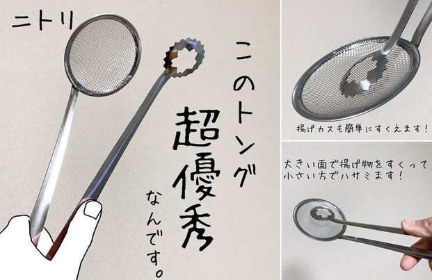 揚げ物を鍋から取り出すとき、トングや菜箸だとつかみにくいなと思っていた@piyooo.say さんは「揚げ物トング」を見つけて揚げものストレスがゼロに。「網じゃくしとトングの一体型で、すくうとつかむがひとつでできるんです。細かく散らばりがちな揚げカスを取るのも簡単! 網じゃくしの部分が大きくて、角度もついているせいか、一般的なトングよりも食材をつかんだり、すくったりがしやすいように思います。小さくて細かいフライドポテトのようなものを揚げるときにその能力を存分に発揮してくれて、一度でたくさんすくえて便利ですよ。しかも約150円というコスパの高さも素晴らしい。ぜひこの便利さを味わってほしいですね」