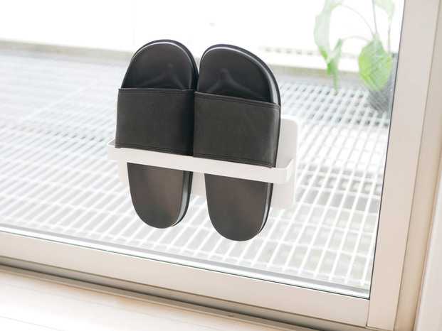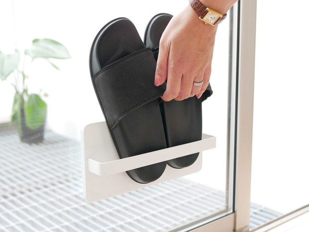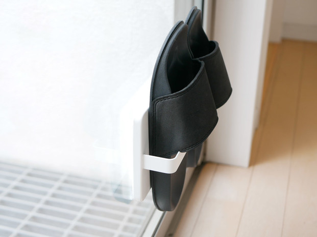 「ツーウェイ ベランダスリッパラック」は、窓の内側や外側に吸盤でピタッと取り付けてスリッパを収納できるので、雨上がりも乾いたスリッパでベランダに出られます。