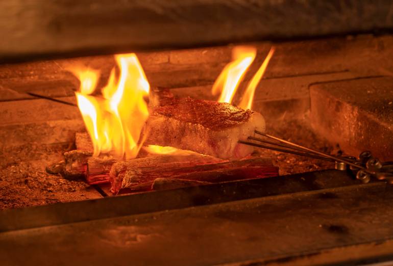 その絶品の肉を、紀州備長炭を使った炉窯でじっくり焼き上げる。高温の炭火で表面はクリスピーに、内部は炉釜特有の遠近赤外線効果でさらに美味しさを引き出すのだ。
