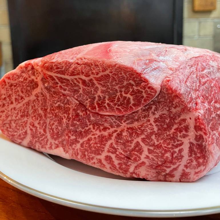 ステーキには最高品質かつ希少な純血統未経産長期肥育の但馬牛の赤身肉を使用。肥育期間34カ月から36カ月と長期間肥育することで、牛の持つ脂の融点が下がり、赤身の筋繊維のキメが細かくなるため、濃密な旨味を醸し出す。