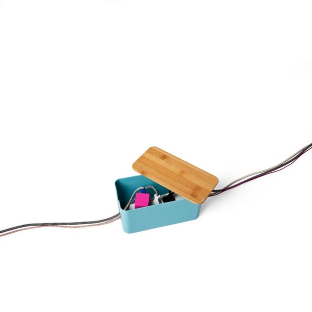 ワイヤーとケーブルを保管できる収納ボックス。これなら、インテリアの邪魔になってしまうケーブルも、すっきり収納が叶います。おしゃれな木製の蓋と、きれいなブルーが素敵ですね。