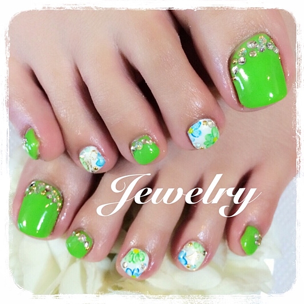 今日は瑞樹ちゃんがフットにきてくださいました✨ お花を、スポンジでぼかしたようなartです 夏仕様でかわいいです http://t.co/5W0onOAegz