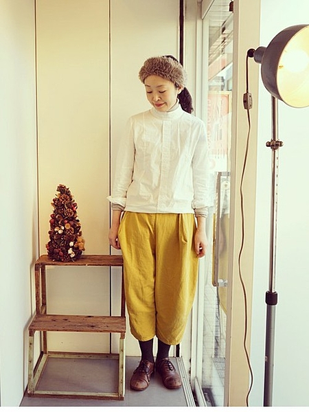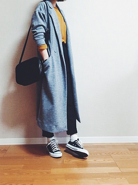 かぼちゃ色をメインにしたいから、スニーカーはボトムスと同じ暗めの色をチョイス。
