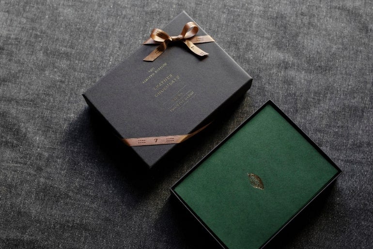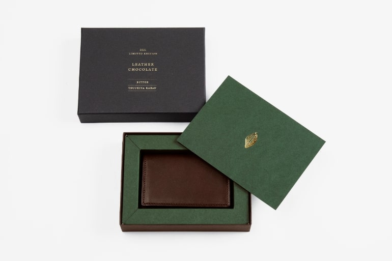 ギフトボックスには金箔押しで“LEATHER CHOCOLATE”の文字を刻印。中にはグリーンをあしらって彩りを添え、あたかもチョコレートギフトを思わせる特別な仕立てがうれしい。