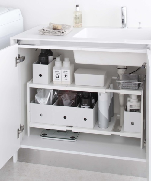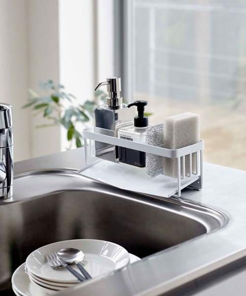 ホルダーの下に設置されたトレーから、直接シンクに水が流れる構造になっていてスポンジやボトルから出る水がたまらないのが特徴。お手入れも簡単だから、いつでもスッキリさせることができます。
