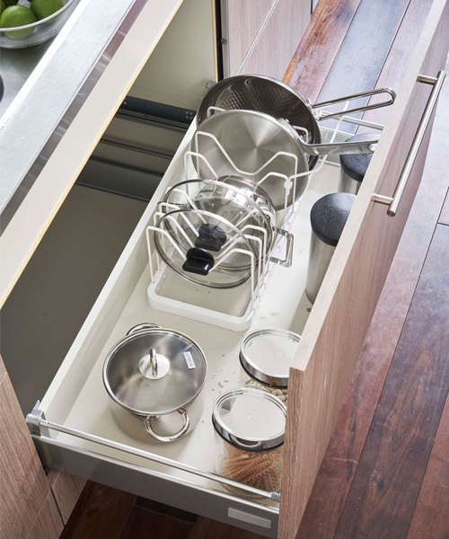 重ねてしまっておくとスペースをとったり、取り出しにくくなってしまうフライパンや、鍋のふたは立てて収納するのがベスト。どこに何があるのか見やすく、取り出すのも簡単。収納力もアップしますよ。