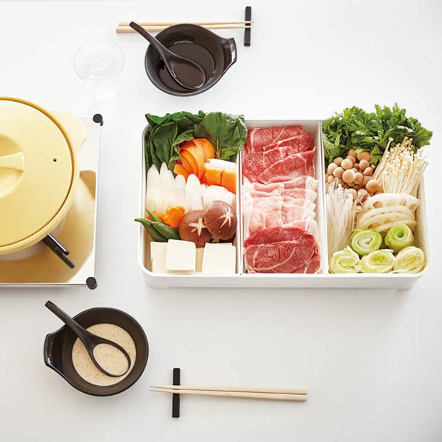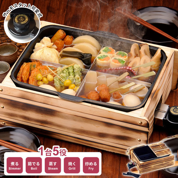 おでん屋さんの雰囲気を楽しめる「おでん鍋」。おでんだけでなく、煮る・茹でる・蒸す・焼く・炒めるの一台5役をこなす優れものです。型崩れを防ぐ仕切りが付いているのもうれしいですね。