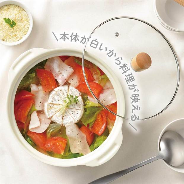 コロンとした形が可愛い鍋。本体が白いので料理が映えますね。ふたが透明なのも、中が見えるので思いのほか便利です。直火、IHのどちらも対応しているので使い勝手も抜群。