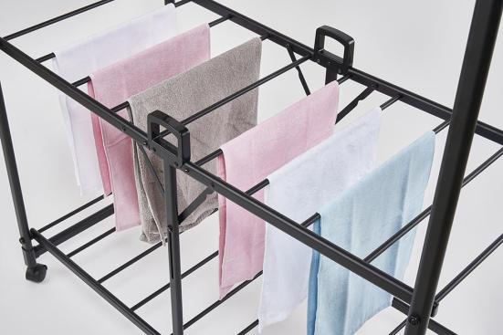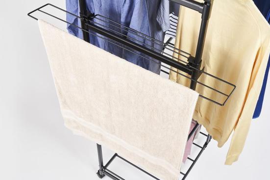 たたむと幅11cmのコンパクトさで、重量はわずか2.95kgと取り回しやすいうえ、さまざまなギミックが付いていて洗濯物をたっぷり干せます。見た目も安っぽさはなく、マットな黒の色合いがオシャレ。家の中にあってもダサ見えしません!